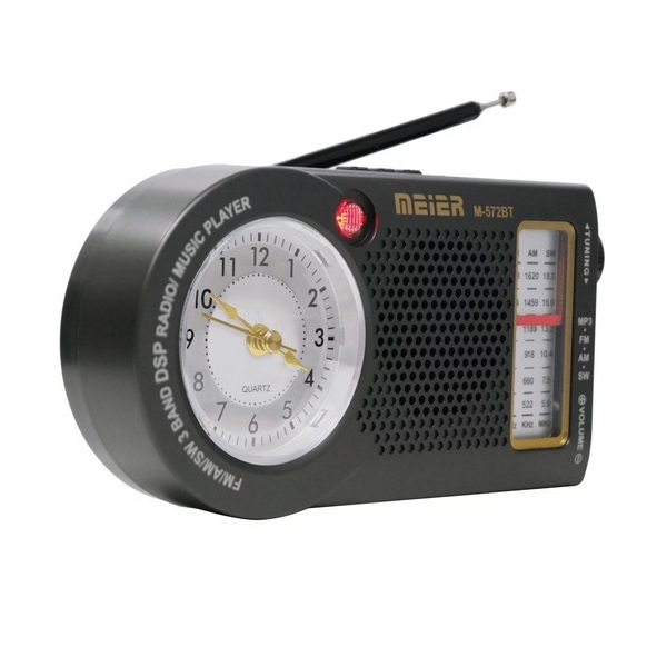 La Radio et Haut-parleur Sans fil MEIER M-572BT avec Horloge est un appareil portable multifonctionnel offrant la radio (capte les bandes AM, FM et ondes courtes SW), un haut-parleur (lecture MP3 via Bluetooth, carte TF et USB).