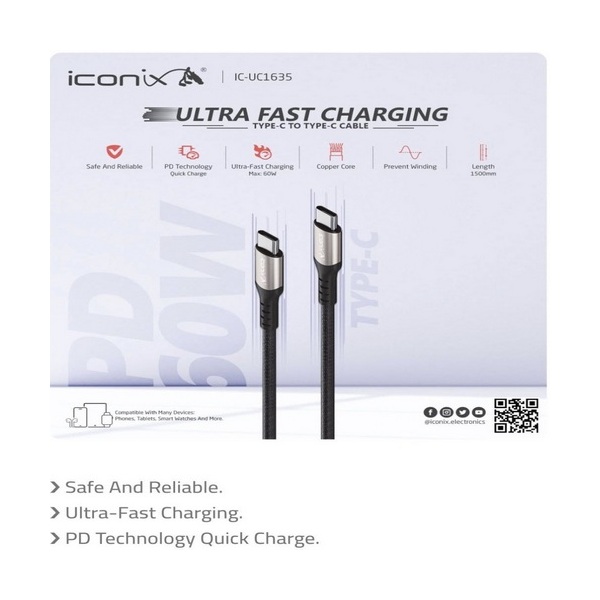 Le câble ICONIX IC-UC1635 est un câble de charge ultra-rapide et de synchronisation de données haute performance, conçu pour les appareils utilisant une connectique USB-C vers USB-C.