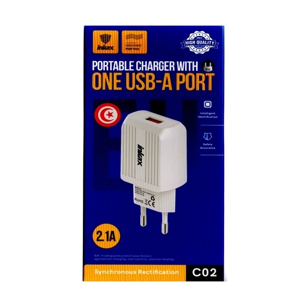 Le chargeur USB INKAX C02 2.1A est un adaptateur mural simple port USB, il offre une puissance de 10W et un courant de sortie de 2.1A. Il est conçu pour fournir une charge efficace aux appareils compatibles.