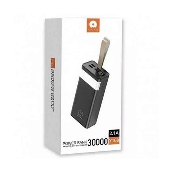 Power Bank WUW Y108 – Capacité de Batterie : 30 000 mAh Ports : 1 x Micro USB (entrée) 1 x Type C (entrée/sortie) 2 x USB (sortie) Charge simultanée : Jusqu’à 2 appareils à la fois Indicateur LED : Affichage du niveau de batterie Charge rapide : Sortie jusqu’à 2,1A Batterie : Li-polymère Sortie : DC 5V/2.1A (max) Entrée : 5V/2.1A Puissance de sortie : 10W Couleur : Noir – Garantie : 6 mois