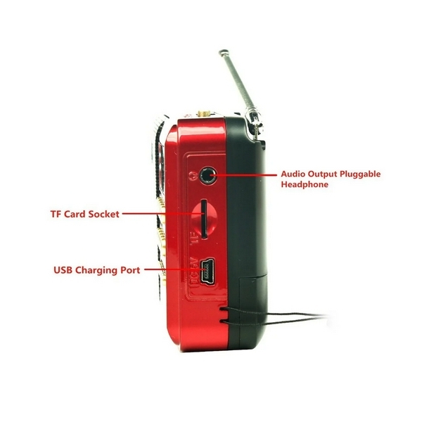 Radio FM 87.5-108 MHz – Mémorisation 55 stations – Pavé numérique d’accès direct – Affichage LED numérique rouge – Connectivité Bluetooth sans fil – Lecteur USB et Carte Micro SD (MP3) – Entrée Jack 3.5mm (Casque/Aux) – Haut-parleur magnétique 2,25 pouces – Puissance 3 Watts RMS – Batterie amovible type BL-5C (Nokia) – Rechargeable via Micro-USB – Couleur Rouge – Format de poche avec dragonne.