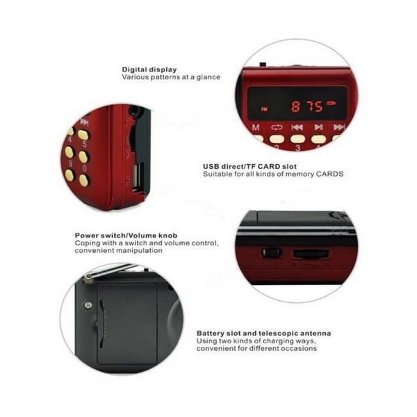 Radio FM numérique avec mémorisation automatique – Lecteur MP3 via USB et Carte Micro-SD – Connectivité Bluetooth sans fil – Technologie TWS (couplage stéréo avec une deuxième radio) – Triple alimentation (Panneau solaire intégré, Batterie 18650 remplaçable et Secteur AC 110V/220V) – Affichage digital précis – Design rétro compact coloré