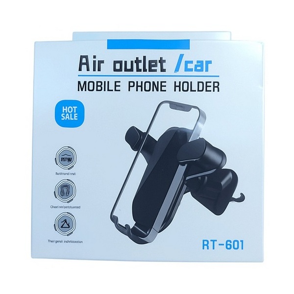 Modèle : RT-601 – Fixation : Grille d’aération (Air Outlet) – Type : Gravité, verrouillage automatique par le poids du téléphone – Rotation : 360° – Matériau : ABS et silicone – Design : Triangle de stabilité – Compatibilité : Universelle pour smartphones
